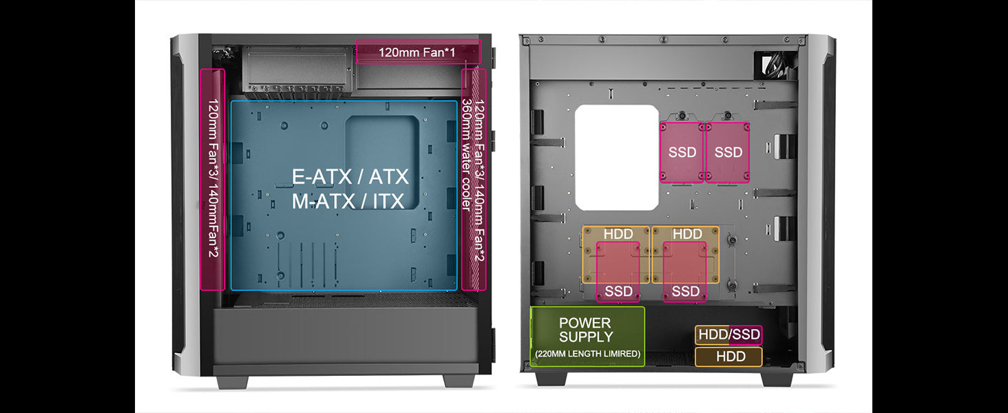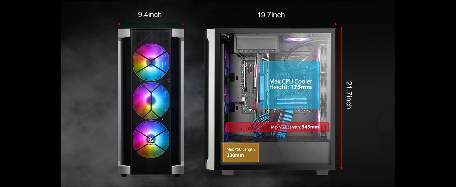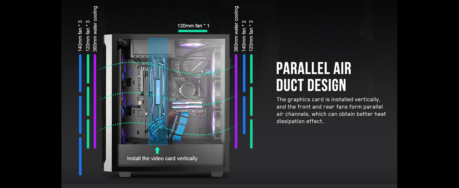 Spacious Open interior: Gaming computer case supports up to E-ATX motherboard, and up to 360 mm water cooling radiator in front or 360 mm in rear, with vertical GPU 345 mm support which no need to worry about deformation