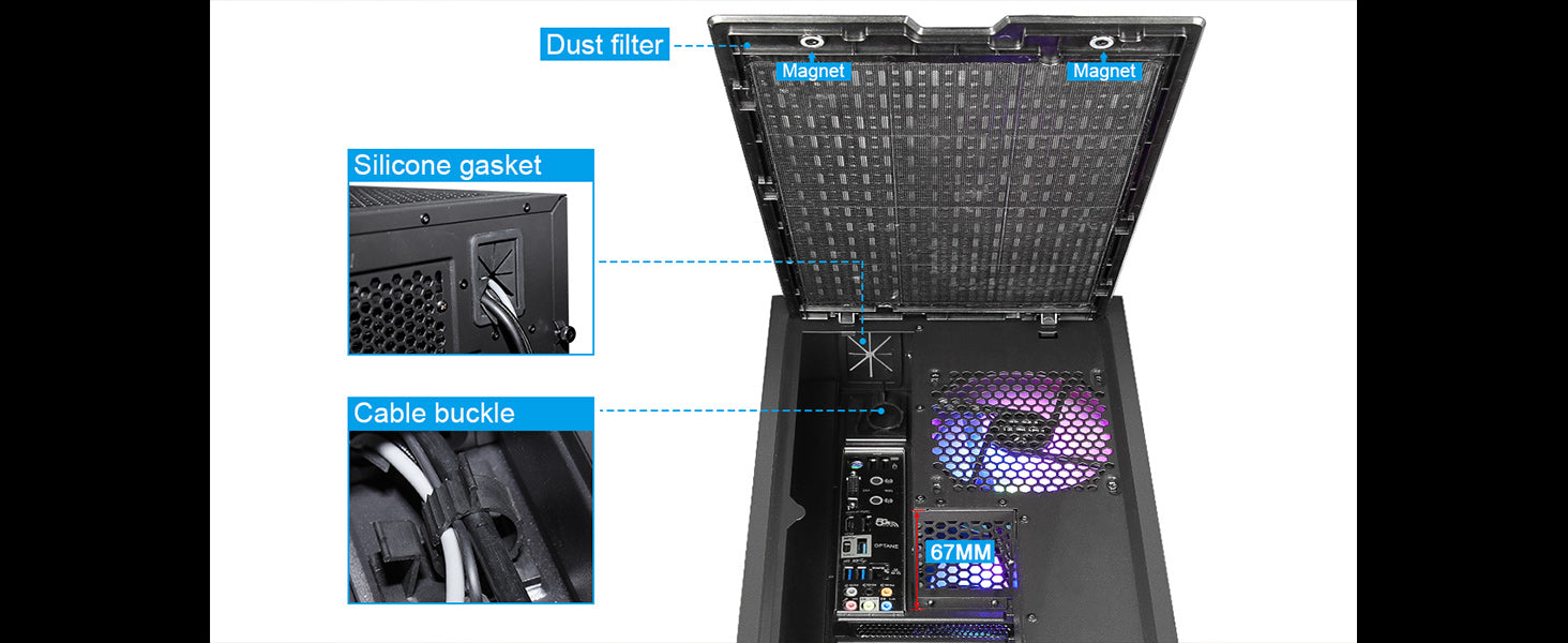 Dust-proof Design: The upper and lower parts are equipped with Pull-out dustproof filters, including the magnetic dust proof net on the front panel, which can effectively prevent dust from entering the gaming pc case and easy to keep clean