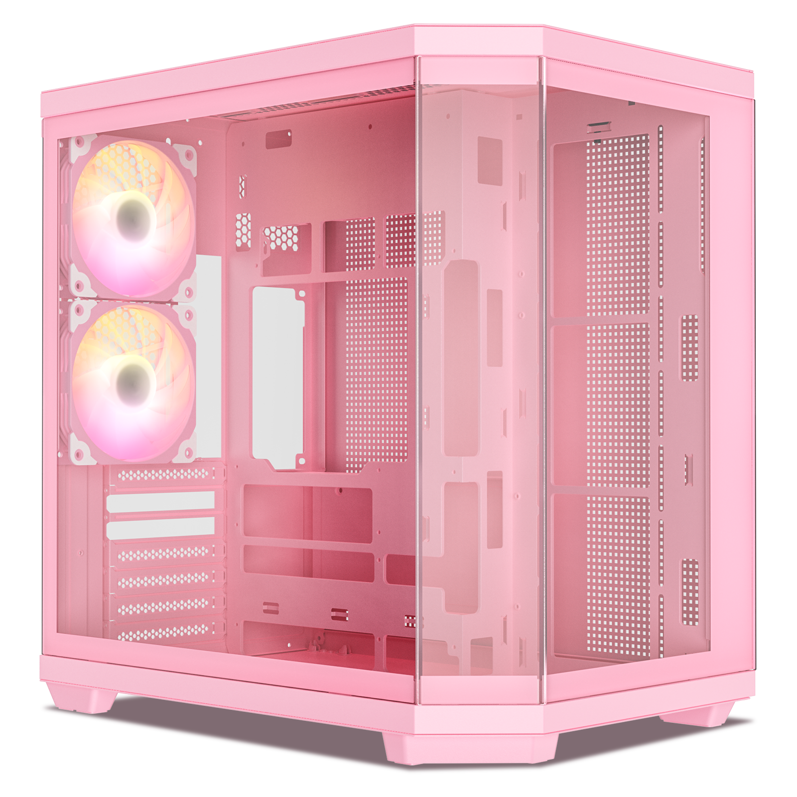- Full View: Features three pieces of high-clarity tempered glass, offering a panoramic view of your components and RGB lighting from the front and side